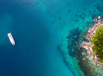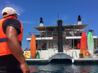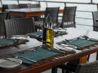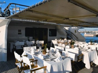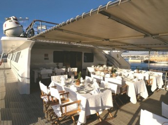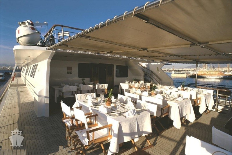 Na vonkajšej palube je taktiež tienená jedálenská časť s výhľadom na more, kde sa odohrávajú obedy formou bohatého bufetu. V priemere dvakrát do týždňa sa koná barbecue priamo na palube alebo na brehu.