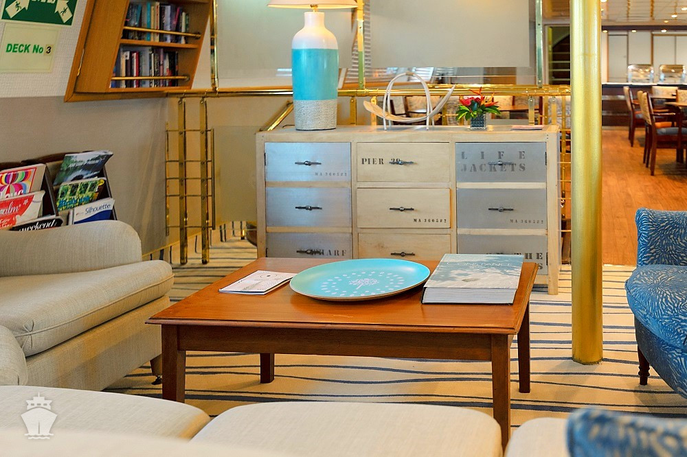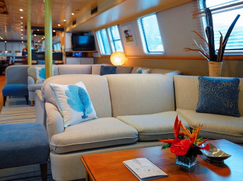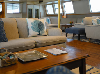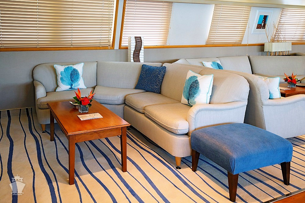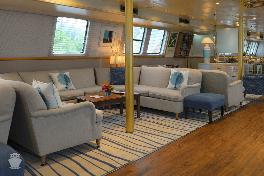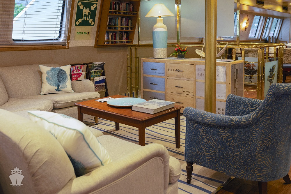 Na hlavnej palube sa nachádza komfortný salón, vybavený pohodlnými kreslami a elegantný bar. Vedľa salónu nájdete knižnicu s výberom kníh v rôznych jazykoch a k dispozícii sú aj rôzne spoločenské hry.
