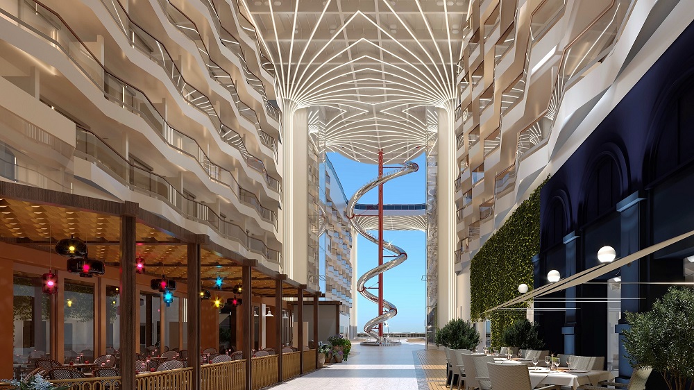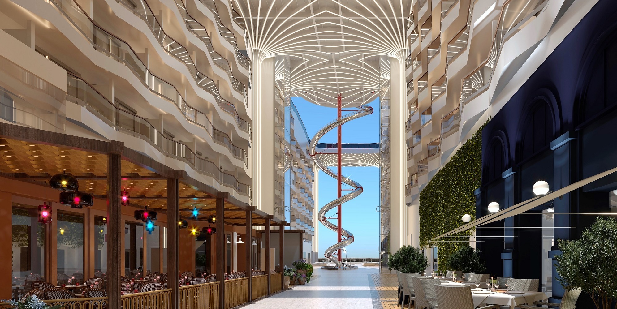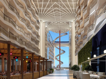 Jedným z kľúčových prvkov lodnej promenády je The Spiral - architektonicky pozoruhodný tobogán, ktorý sa stáča cez neuveriteľných 11 palub - a bude najdlhším suchým toboganom na mori! Elegantné krivky pôsobivého sklzu z nehrdzavejúcej ocele z neho robia skutočné umelecké dielo a je to i zábavný spôsob, ako sa rýchlo dostať z vrcholu lode na promenádu.