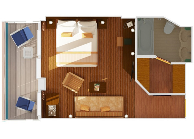 OS - Ocean Suite 25 m² + balkón 6 m². 7. paluba vpredu, stred. Max 4 osoby. Výhody Suite. 2 010 € 1 005 € za osobu