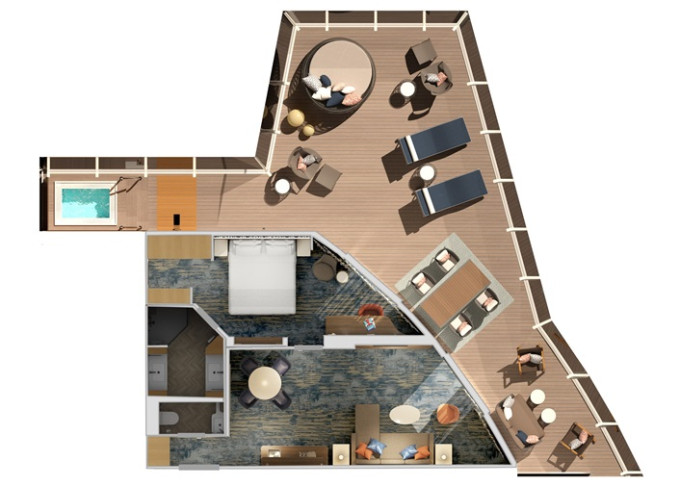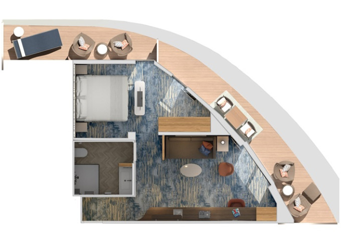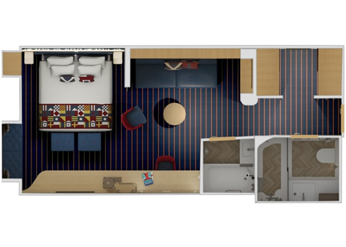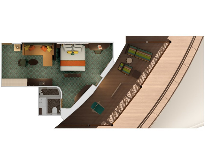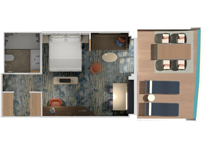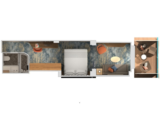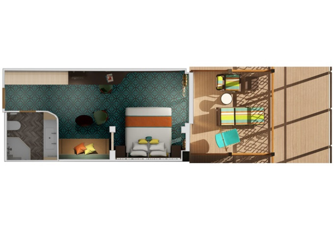 HU - Suite Havana Cabana Corner 32 m² + vonkajšie rohové patio 15 m². 8. paluba vpredu. Tropický štýl, vstup do exkluzívnej zóny Havana. Výhody Suite. | 5 248 € 2 624 € za osobu |