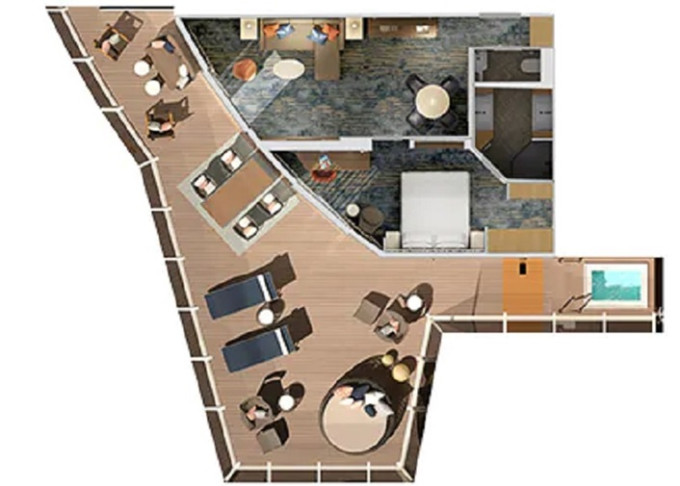HS - Suite Havana Cabana 28 m² + vonkajšie patio 8 m². 8. paluba vpredu. Tropický štýl, vstup do exkluzívnej zóny Havana. Výhody Suite. Táto kajuta je určená pre hostá od 12 rokov. | 3 572 € 1 786 € za osobu | ||