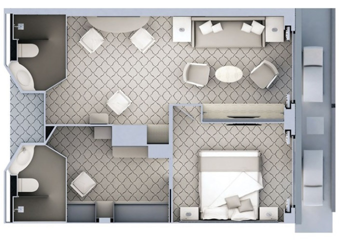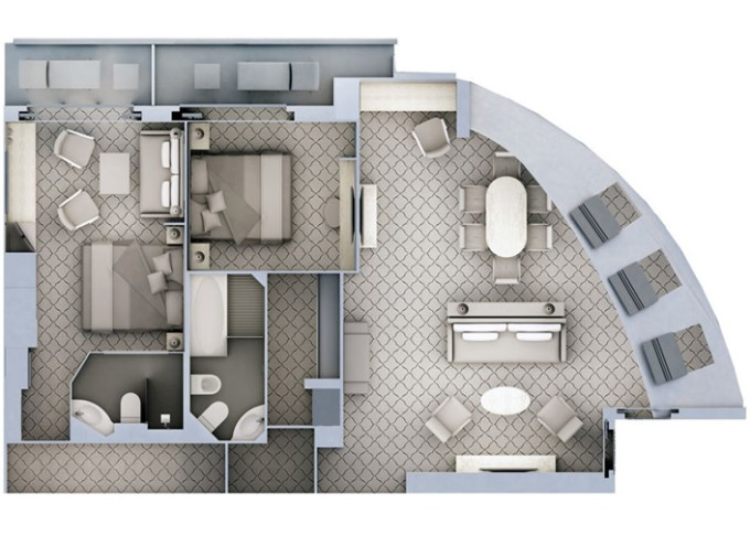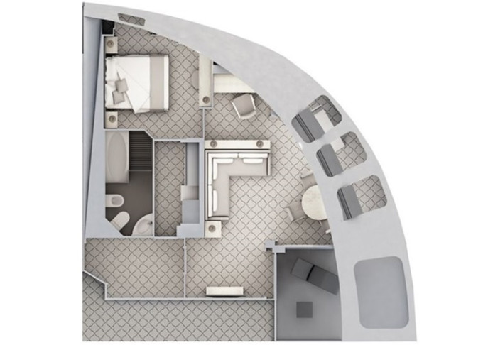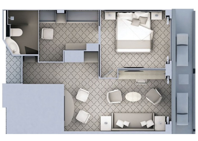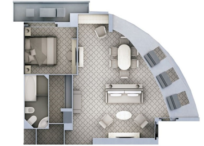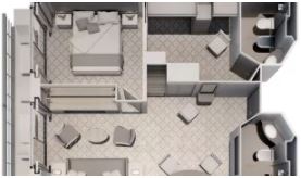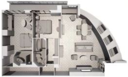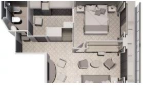 R1 - Royal Suite 1 69 m² (vrátane balkóna 12 m²). 6. paluba. Max 3 osoby. 149 200 € 37 300 € za osobu