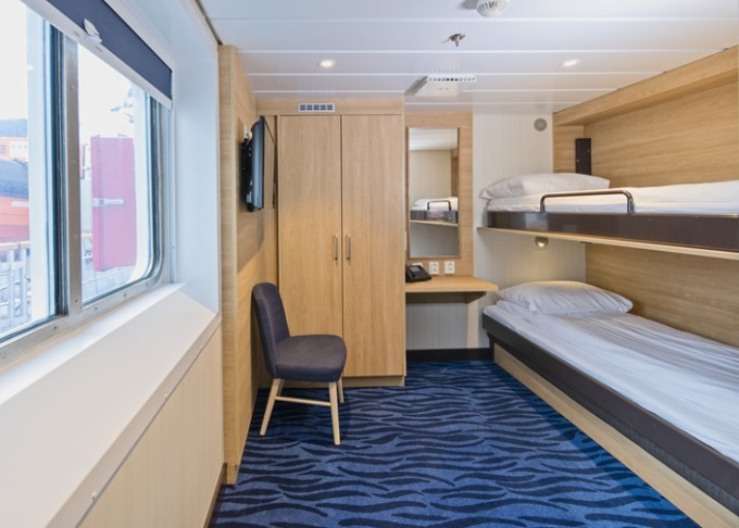 J3 - Vonkajšia kajuta Polar / obmedzený výhľad 11-12 m². Neotvárateľné okno s obmedzeným výhľadom. Spodné lôžko + 2 vyklápacie, Tv, sejf, varná kanvica. 6. paluba. Max 3 osoby. | 9 012 € 4 506 € za osobu | ||