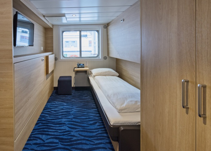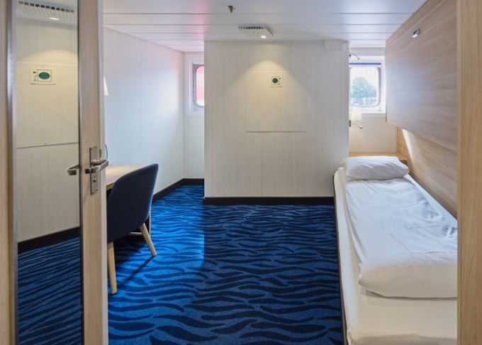 AJ - Vonkajšia kajuta Polar / obmedzený výhľad 8-9 m². Neotvárateľné okno s obmedzeným výhľadom. Spodné a horné lôžko.Tv, sejf, varná kanvica. Max 2 osoby. | 9 102 € 4 551 € za osobu |