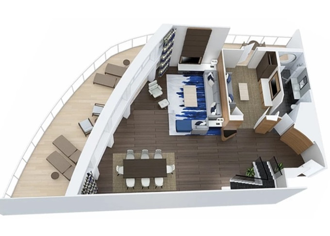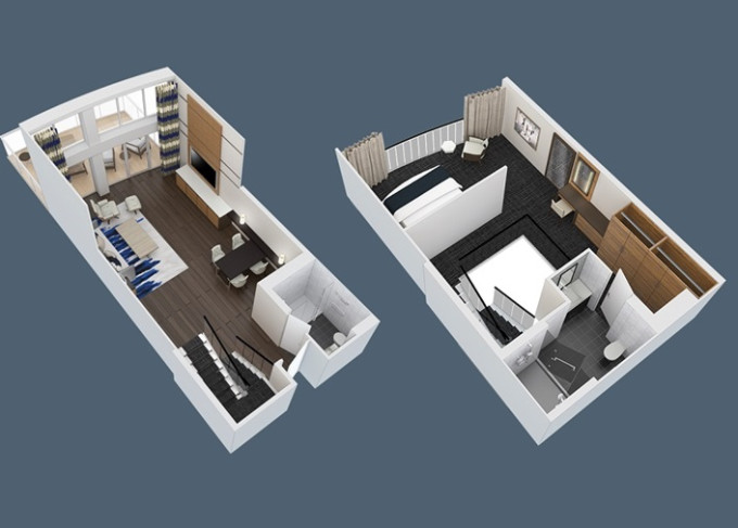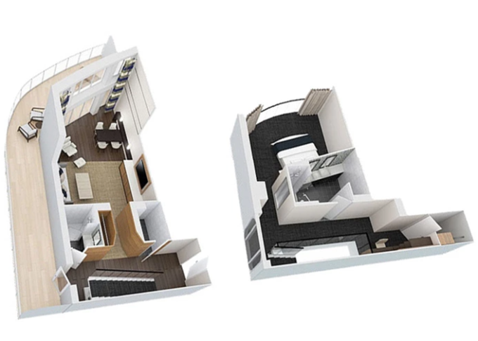 OL - Owner Loft Suite s balkónom 90 m² + balkón 46 m². 2-podlažný apartmán, 2 spálne, 2 kúpeľne. 8. paluba. Max 4 osoby. Výhody Royal Suite Class. | 8 642 € 4 321 € za osobu |