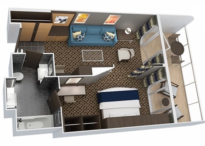 CI - Vnútorná kajuta s virtuálnym balkónom Connecting 15 m². Obrazovka veľkosti balkónových dverí s premietaným výhľadom. Prepojiteľná kajuta. 3/7. až 13. paluba. Max 2-4 osoby. | 2 790 € 1 395 € za osobu |