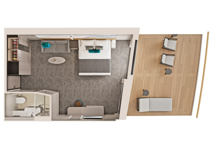 H5 - The Haven Owner's Suite 50-57 m² / balkón 10-12 m².12. paluba, Max 4 osoby. Výhody The Haven. | 8 720 € 4 360 € za osobu |
