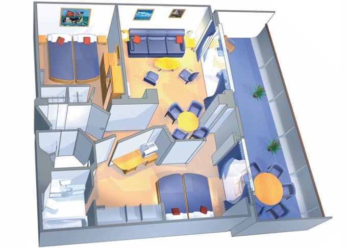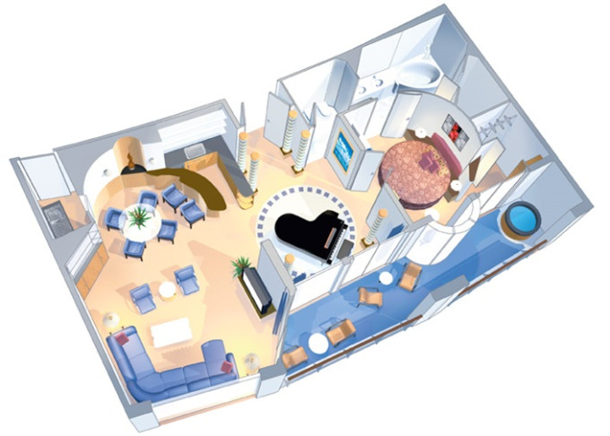 OS - Owner’s Suite s balkónom 47 m² + balkón s vírivkou 6 m². 10. paluba. Max 4 osoby. Výhody Suite. | 6 568 € 3 284 € za osobu |
