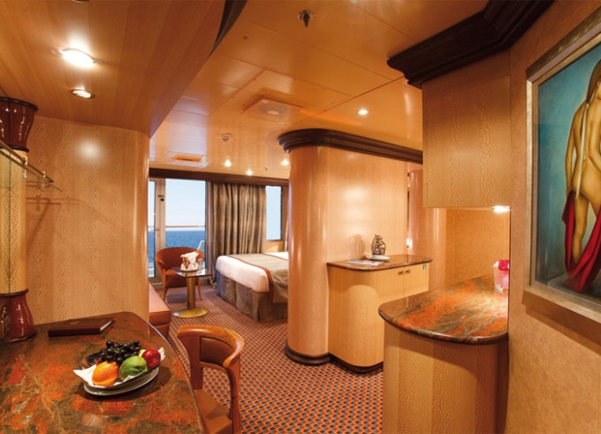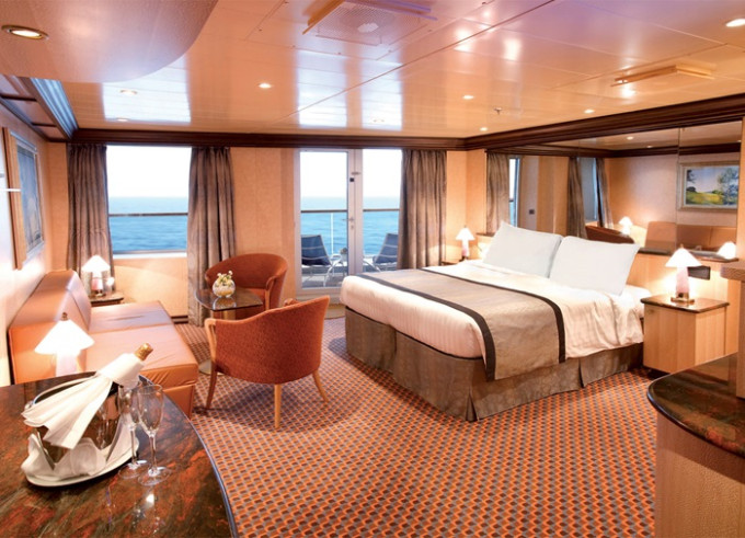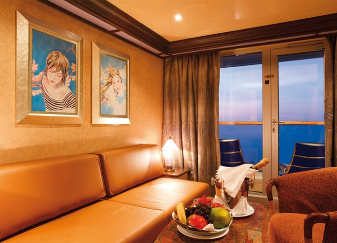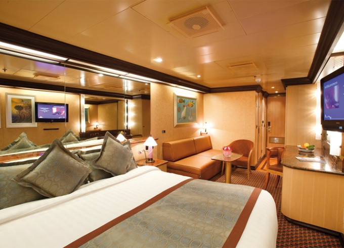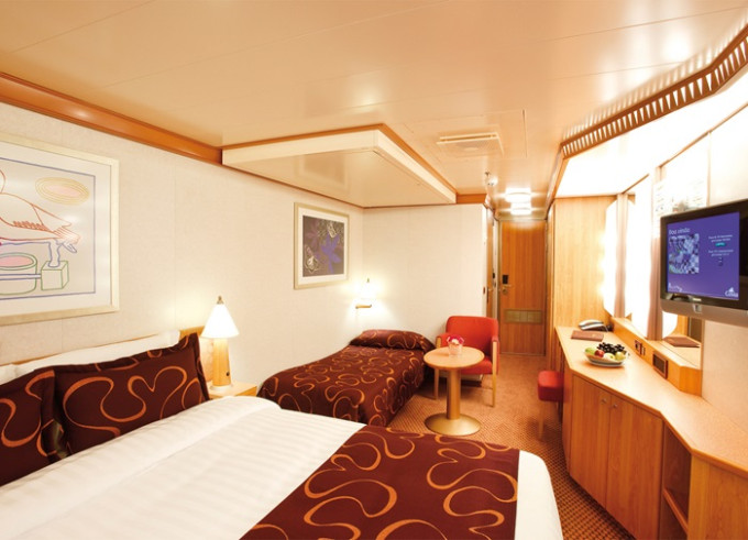 - Ubytovanie v kajute vybranej kategórie. Základné vybavenie: kúpeľňa s WC a sprchovacím kútom, 2 lôžka spojiteľné do manželskej postele, skrine, nočné stolíky, toaletný stolík a stolička, nastaviteľná klimatizácia, interaktívna satelitná TV s plochou obrazovkou, trezor, sušič na vlasy, uteráky a posteľné prádlo, Wi-Fi pripojenie (za poplatok), 24/7 kajutová služba (za poplatok).