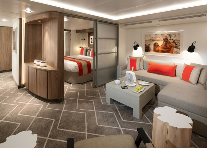 CS - Celebrity Suite 43 m² + balkón 5 m². 11,12. paluba. Max 4 osoby. Výhody Suite. 8 607 € 8 607 € za osobu