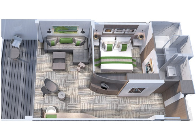 CS - Celebrity Suite 37 m² + balkón 9 m². 11,12. paluba vpredu. Max 4 osoby. Výhody Suite. 8 424 € 4 212 € za osobu