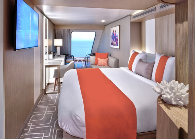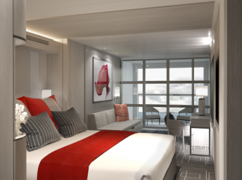 • Kajuty sú umiestnené v blízkosti lodného Spa. K ich vybaveniu patrí posilnený systém vzdušnej filtrácie, posteľ Queen-Size (v kategóriách Edge King-Size), veľké zasúvacie sklenené dvere, exkluzívne posteľné prádlo eXhale®, veľkorysé skladovacie priestory.