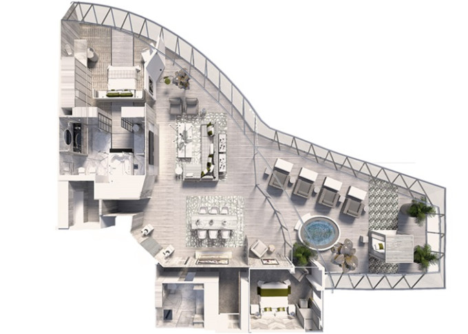 IC - Iconic Suite s balkónom 176 m² + terasa s vírivkou 64 m². 2 spálne, 2 kúpeľne (1 s vírivkou).12. paluba vpredu. Max 6 osôb. Výhody Suite. 25 516 € 6 379 € za osobu