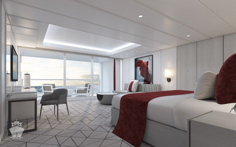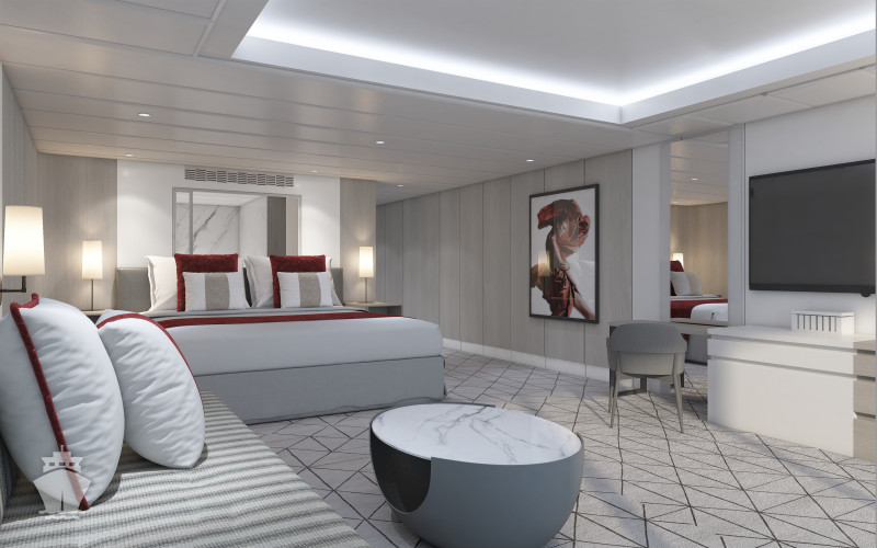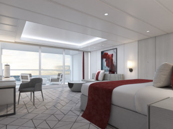 PS - Penthouse Suite 128 m² + balkón 18 m². 2 spálne, 2 kúpeľne (1 s vírivkou). 12. paluba vpredu. Max 6 osôb. Výhody Suite. 19 428 € 6 476 € za osobu