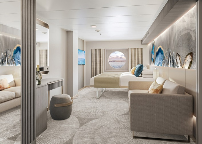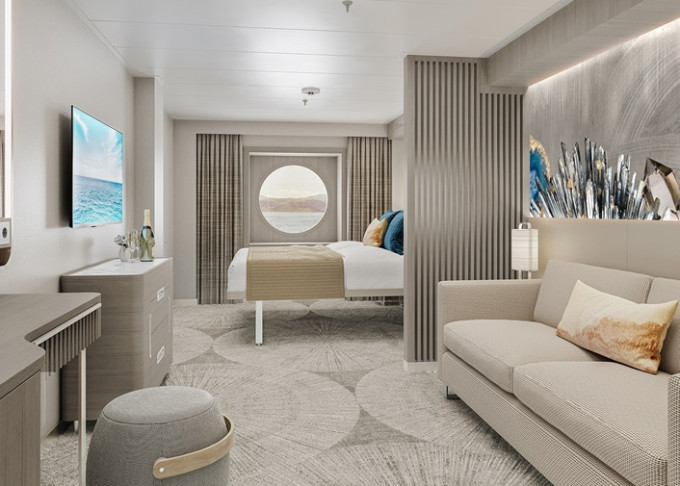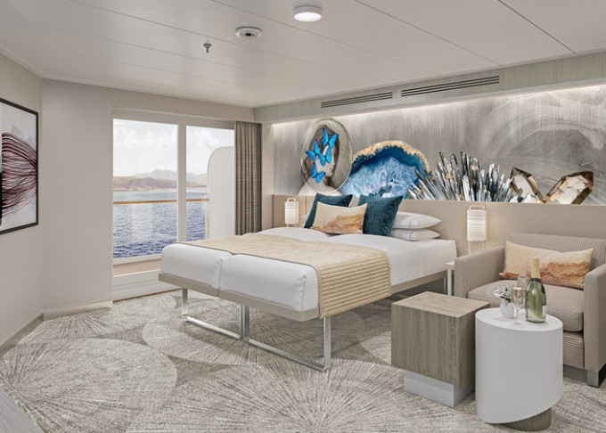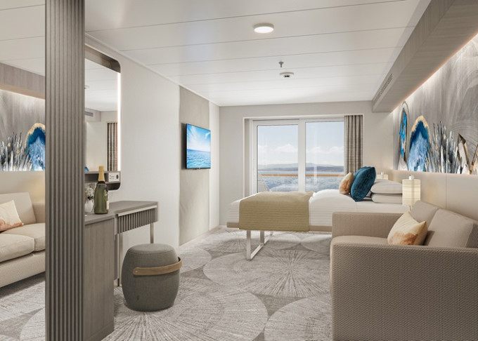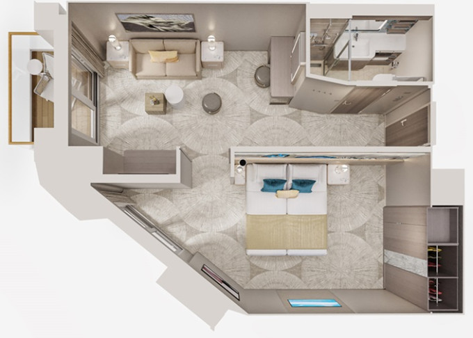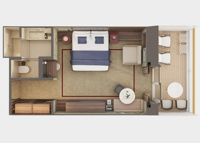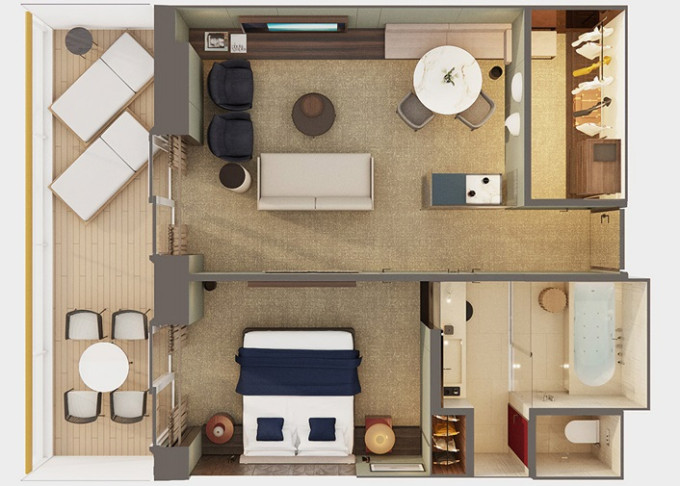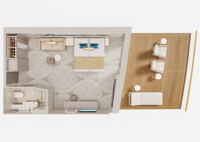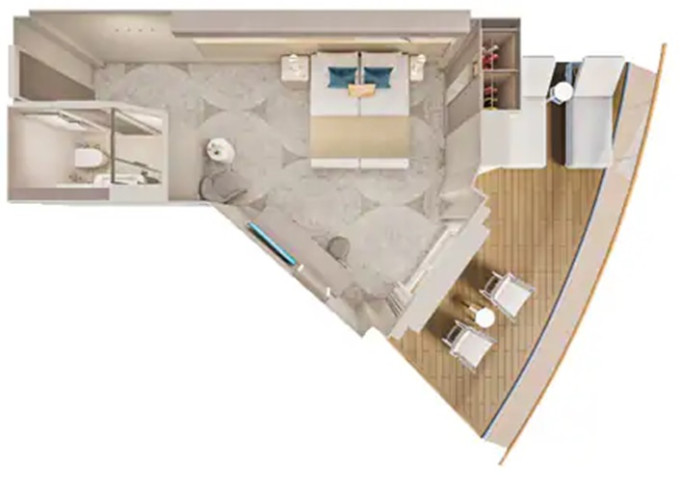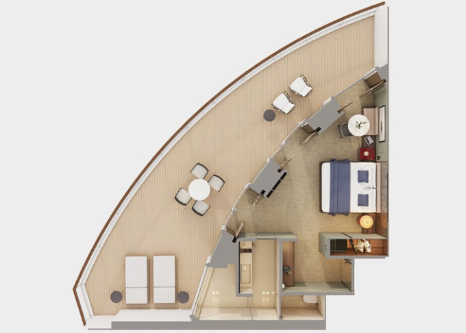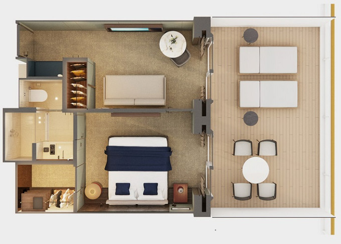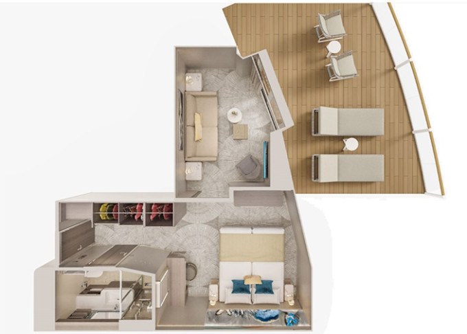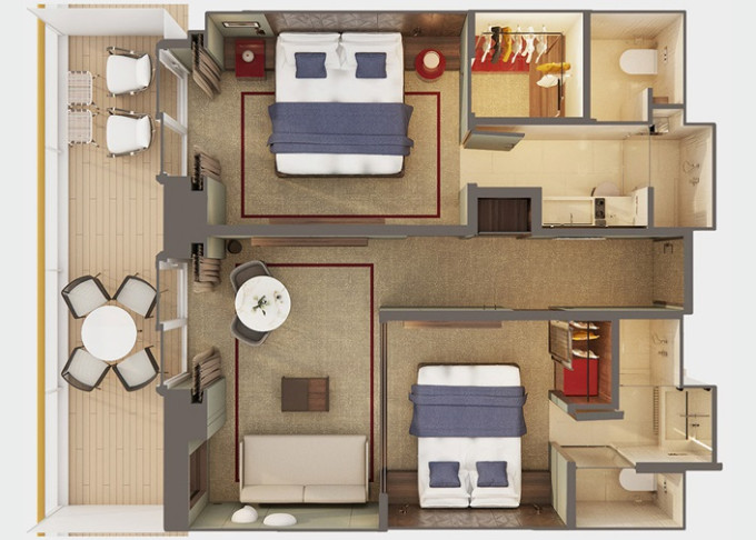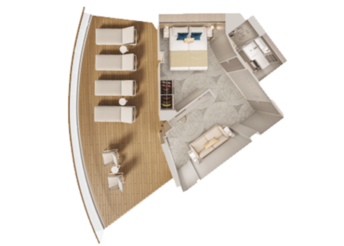 SH - Suite s veľkým balkónom Aft-Facing 58 m² / balkón 34 m². 9. paluba - vzadu. Max 4 osoby. Výhody Suite. | 6 898 € 3 449 € za osobu |