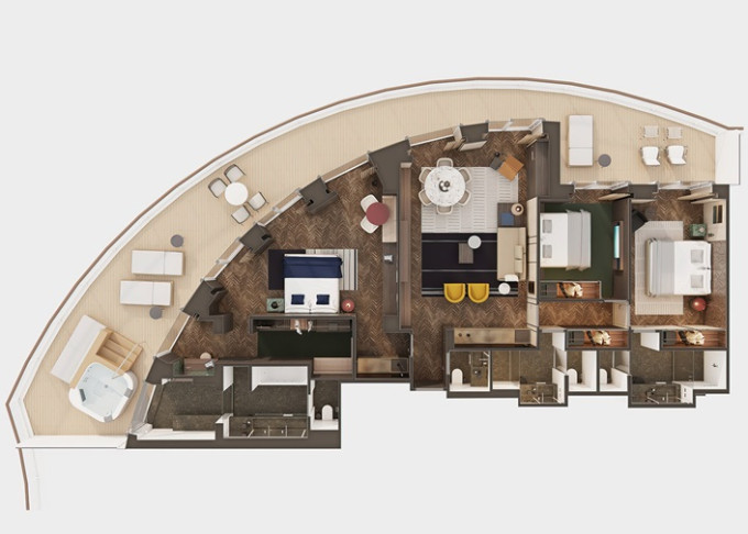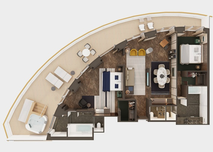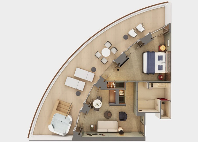 H5 - The Haven Owner's Suite 50-57 m² / balkón 10-12 m². 12. paluba - stred, vzadu. Max 4 osoby. Výhody The Haven. | 7 136 € 3 568 € za osobu |