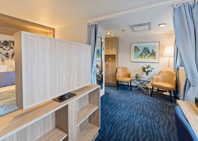 Q4 - Expedition Mini Suite 22 m². Neotvárateľné okno. Obývacia časť, Tv, Wi-Fi, župany, deka, varná kanvica, minibar. 6. paluba. Max 4 osoby. Výhody Suite. | 11 756 € 5 878 € za osobu | ||