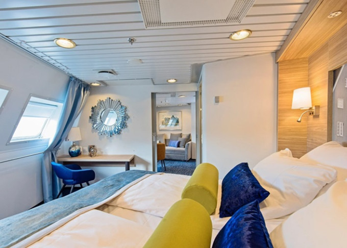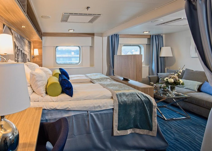 M4 - Expedition Suite s oknami 28-30 m². Neotvárateľné okná. Oddelená spálňa, obývacia časť, Tv, Wi-Fi, župany, deka, varná kanvica. 5. paluba. Max 4 osoby. Výhody Suite. | 14 938 € 7 469 € za osobu |