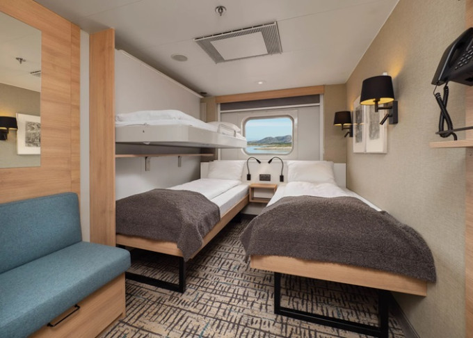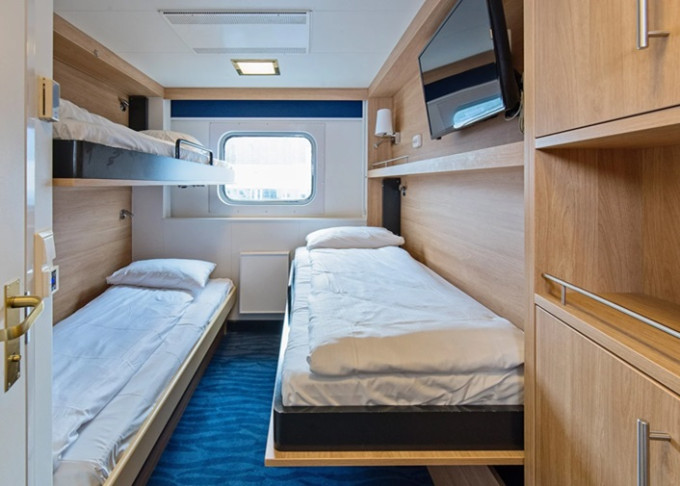 N3 - Vonkajšia kajuta Polar 10 m². Neotvárateľné okno. Oddelené postele + horné lôžko, Tv. 3. paluba. Max 3 osoby. | 3 426 € 1 713 € za osobu | ||