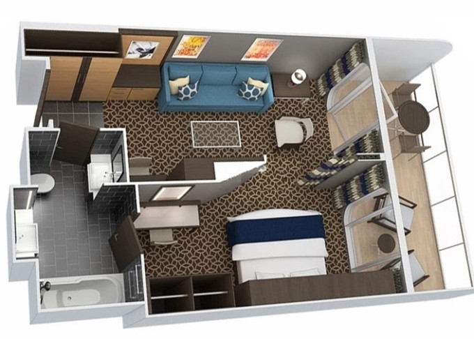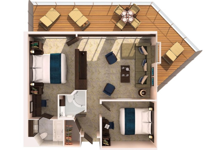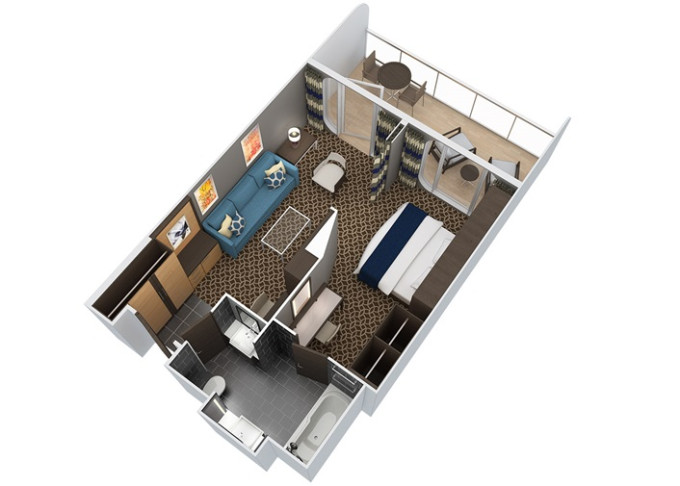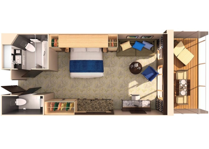 J3 - Junior Suite s balkónom 25 m² + balkón 7,5 m². Max 4-5 osôb. Výhody Royal Suite Sea Class. | 2 458 € 2 458 € za osobu |
