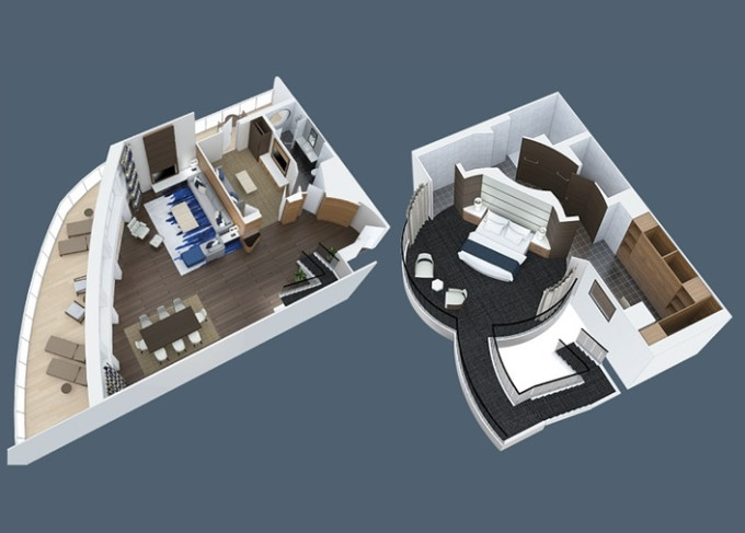 SL - Sky Loft Suite s balkónom 62,5 m² + balkón 17 m². 2-podlažný apartmán. 8/10. paluba. Max 4 osoby. Výhody Royal Suite Sky Class. | 4 074 € 1 358 € za osobu |
