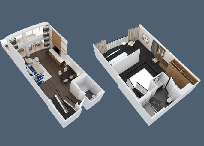 GL - Grand Loft Suite s balkónom 65 m² + balkón 33 m². 2-podlažný apartmán. 8,10. paluba. Max 4 osoby. Výhody Royal Suite Star Class. | 4 340 € 2 170 € za osobu |