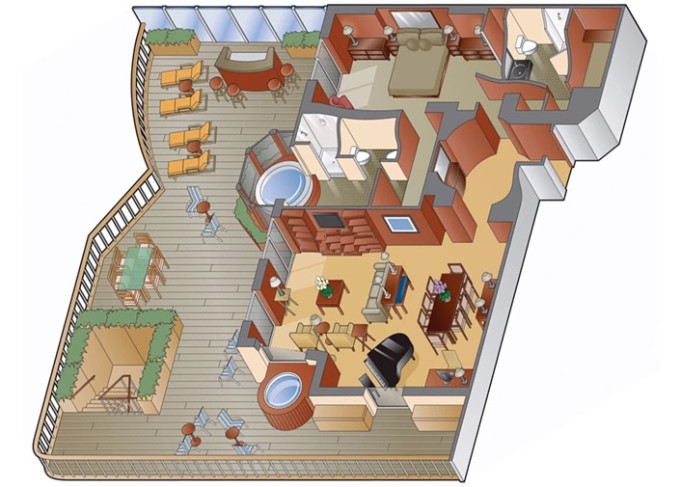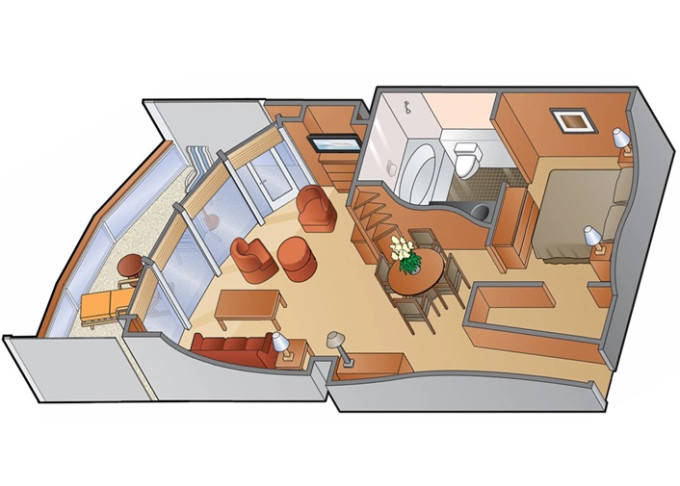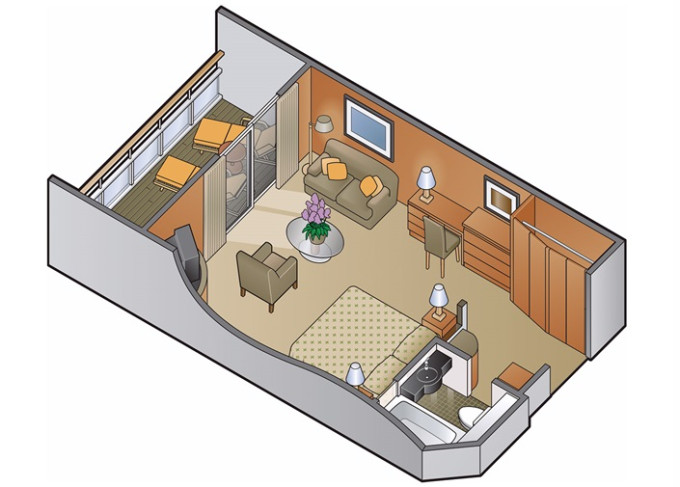 CS - Celebrity Suite 43 m² + balkón 8 m². Kúpeľňa s vírivkou. 6. až 9. paluba stred. Max 3 osoby. Výhody Suite The Retreat. | 4 896 € 4 896 € za osobu | ||
