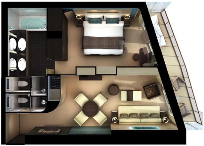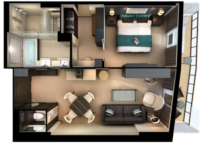 M1 - Club Suite Aft-facing 47-54 m² / balkón 19-25 m². 10. paluba - vpredu.Max 2 osoby. Výhody Club. | 2 092 € 1 046 € za osobu |