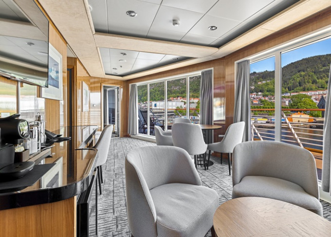 MX - Expedition Owners Suite s balkónom 43-45 m². Balkón, oddelená spálňa, obývacia časť, TV, varná kanvica, minibar, internet. 8. paluba. Max 2 osoby. Výhody Suite. | 15 836 € 7 918 € za osobu |