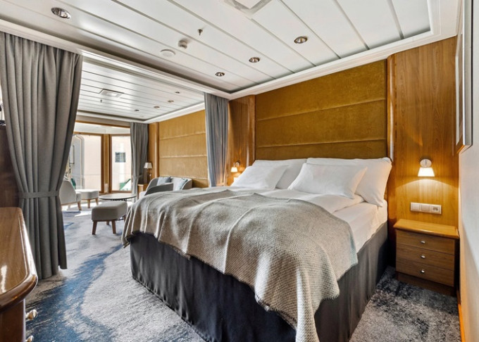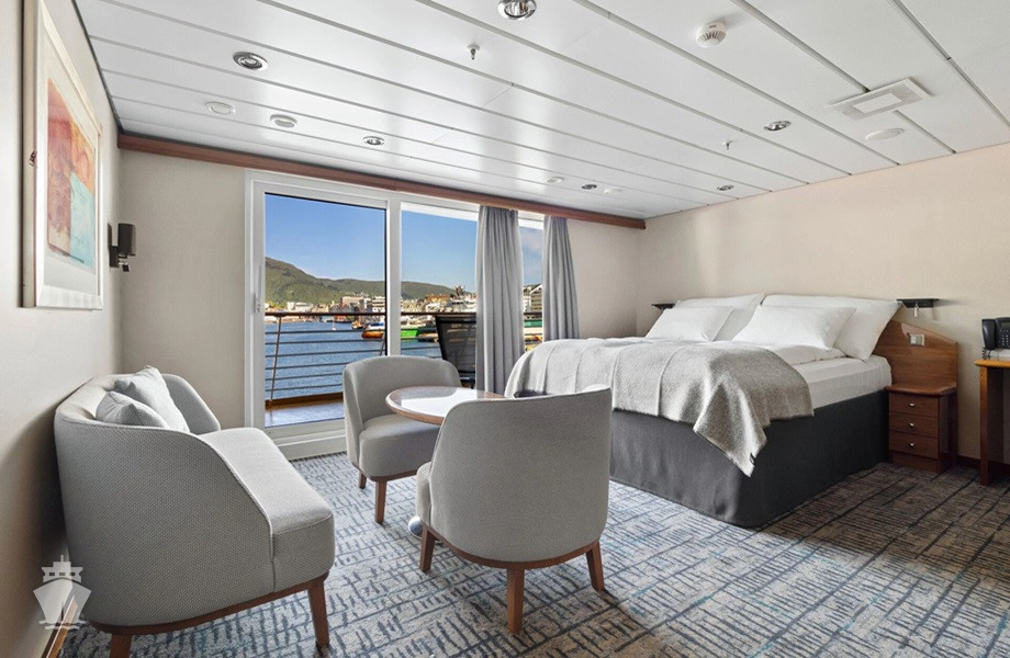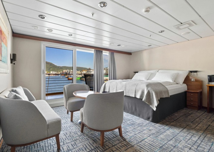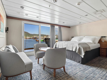 M2 - Expedition Suite na hornej palube s balkónom 23 m². Balkón, obývacia časť, manželská posteľ, TV, varná kanvica, minibar. 7. paluba. Max 2 osoby. Výhody Suite. | 9 430 € 4 715 € za osobu |