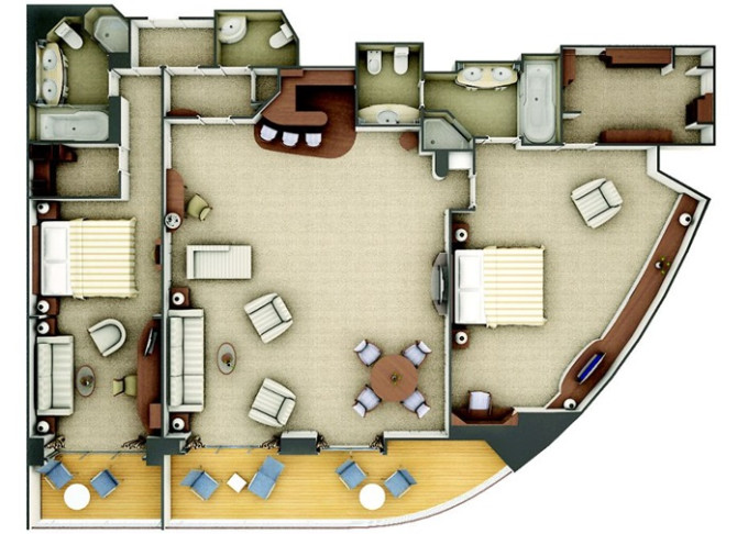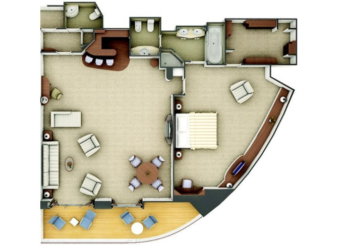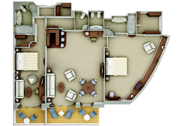 | O2 - Owner's Suite 2 107 m² + 20 m² balkóny. Owners Suite O1 spojená s Vista Suite. 7. paluba stred. Max 5 osôb. | 53 400 € 53 400 € za osobu |