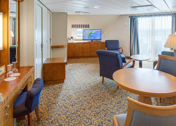 J3 - Junior Suite s balkónom 27 m² + balkón od 3,5 m². 10. paluba. Max 3-4 osoby. Výhody Junior Suite. | 7 120 € 7 120 € za osobu |