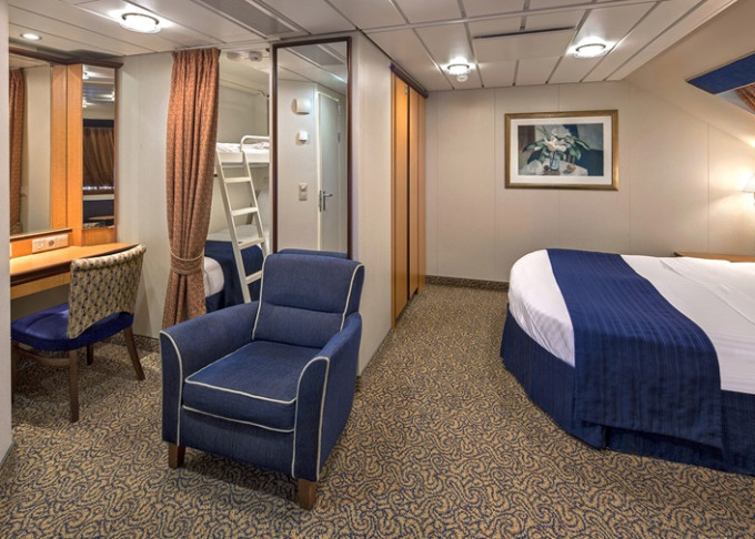 1K - Veľká vonkajšia kajuta Ultra Spacious 24,5 m². Neotvárateľné okno. Oddelená časť s poschodovou posteľou. Max. 5-6 osôb. | 7 203 € 2 401 € za osobu |