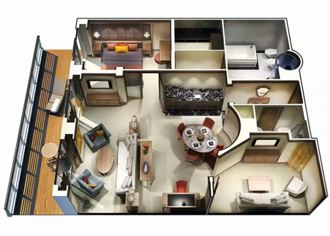 VS - Vista Suite od 87 m² + balkón od 24 m². 8. až 10. paluba. Max 2-3 osoby. 3 izby: spálňa, veľká obývacia miestnosť s jedálenskou časťou, zariadená fitness miestnosť, 2 kúpeľne (1 s vírivkou), šatník. Výhody Vista Suite. | 18 098 € 9 049 € za osobu | ||