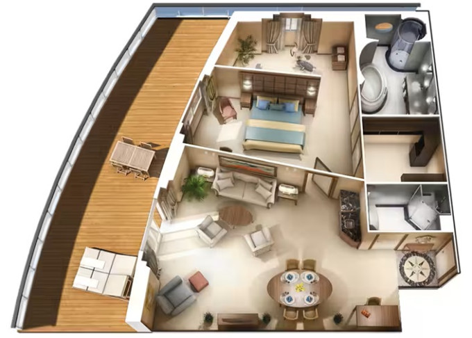 OS - Owner’s Suite 123 m² + balkón od 62 m². 8. až 10. paluba vzadu. Max 2-3 osoby. 4 izby: vstupná hala s pianom, spálňa, veľká obývacia miestnosť s jedálenskou časťou, 2 kúpeľne (1 s vírivkou), 2 šatníky. Výhody Owners Suite. | 23 378 € 11 689 € za osobu |