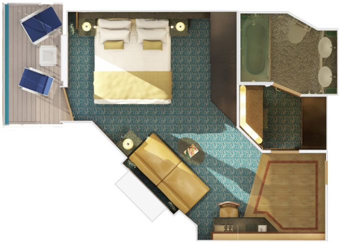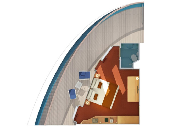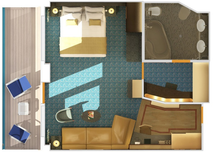 SS - Suite Cloud 9 Spa 25 m² / balkón 6 m². 11. paluba vpredu. Max 3 osoby. Výhody Suite. Voľný vstup do Spa a balíček Cloud 9 Spa. | 2 732 € 1 366 € za osobu |