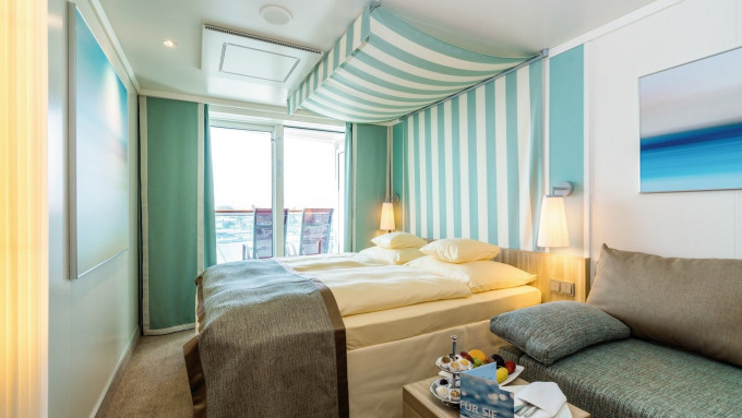 VH - Kajuta s verandou PREMIUM od 16 m² + balkón 6 m². 5,9,10,11. paluba. Max 2 osoby. Cenový model Premium. | 1 690 € 845 € za osobu |