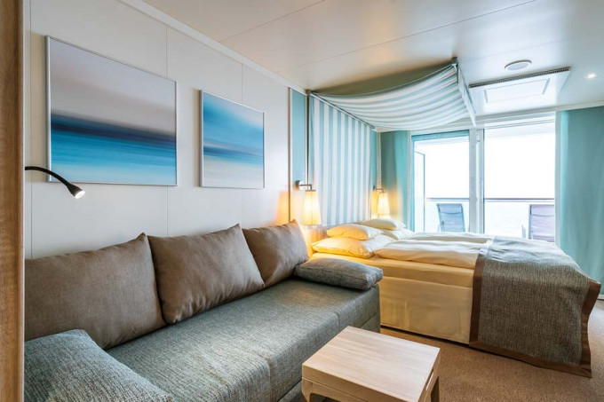 JA - Junior Suite PREMIUM od 32 m² + balkón od 12 m². 8,9. paluba. Max 4 osoby. Cenový model Premium + výhody Junior Suite. | 3 230 € 1 615 € za osobu |