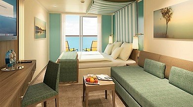VC - Kajuta s verandou Komfort PREMIUM od 20 m² + balkón od 6 m². 5,8,9. až 15. paluba. Max 4 osoby. Cenový model Premium. | 2 430 € 1 215 € za osobu |