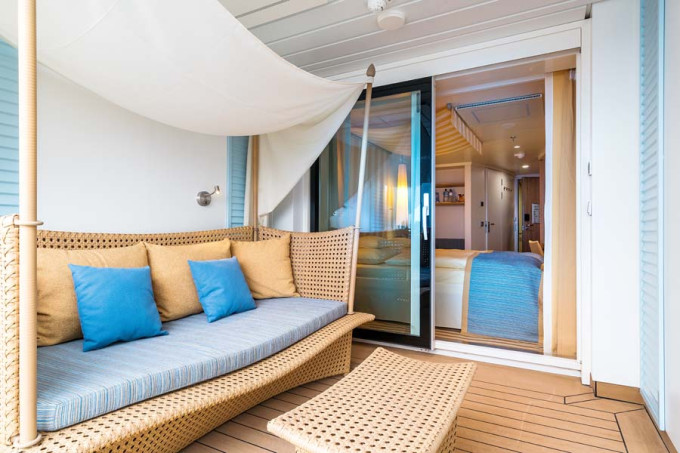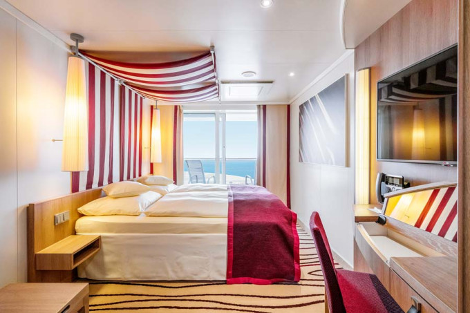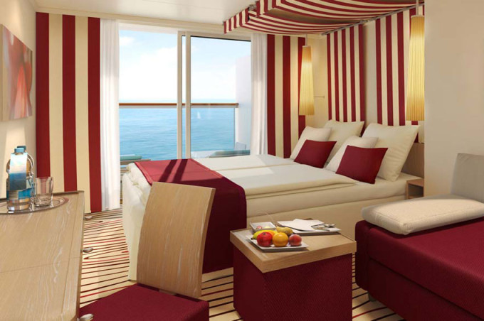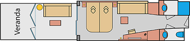 VG - Kajuta s verandou PREMIUM od 16 m² + balkón 6 m². 9. až 14. paluba. Max 4 osoby. Cenový model Premium. | 1 970 € 985 € za osobu |