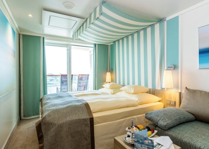 VE - Kajuta s verandou Komfort PREMIUM od 20 m² + balkón od 6 m². Šatník. 5,9,10,11. paluba. Max 3 osoby. Cenový model Premium. | 2 000 € 1 000 € za osobu |