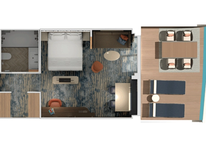 HU - Suite Havana Cabana Corner 33 m² + vonkajšie rohové patio 15 m². 8. paluba vpredu. Max 3 osoby. Tropický štýl, vstup do exkluzívnej zóny Havana. Výhody Suite. | 4 496 € 2 248 € za osobu | ||