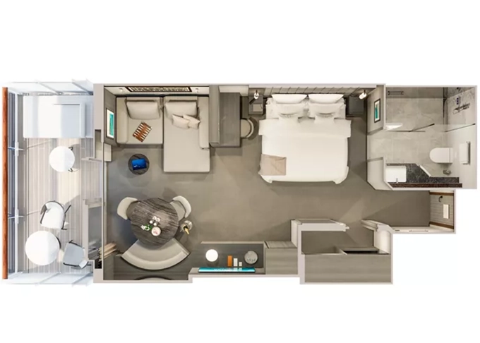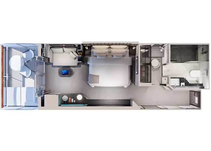 Ocean Residence - Cove Residence Suita + terasa so sedením a lehátkami 56 m². Spálňa s obývacou a jedálenskou časťou, šatník. Koktailová súprava, minibar, kávovar, vodná kanvica, ďalekohľad, sejf, kúpeľňa so sprchou. Závesy, svetlo, klimatizácia ovládané smart technológiou. Taška Technogym Case Kit. Fľaša šampanského na privítanie. Maximálna kapacita 3 osoby. 27 651 € 9 217 € za osobu