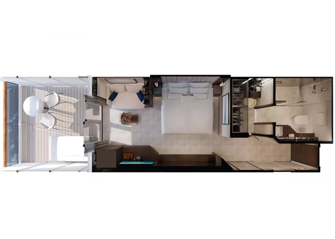 Ocean Residence - Cove Residence Suita + terasa so sedením a lehátkami 56 m². Spálňa s obývacou a jedálenskou časťou, šatník. Koktailová súprava, minibar, kávovar, vodná kanvica, ďalekohľad, sejf, kúpeľňa so sprchou. Závesy, svetlo, klimatizácia ovládané smart technológiou. Taška Technogym Case Kit. Fľaša šampanského na privítanie. Maximálna kapacita 3 osoby. 22 120 € 11 060 € za osobu