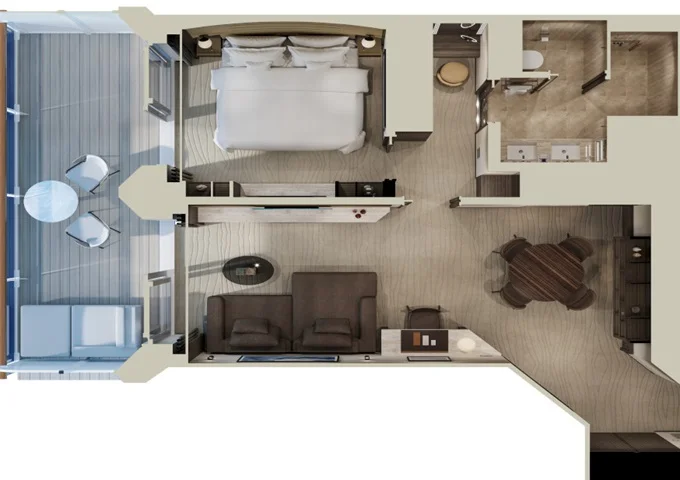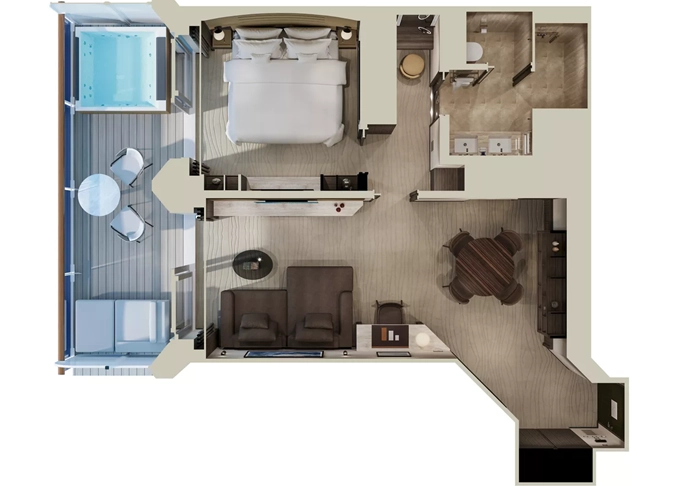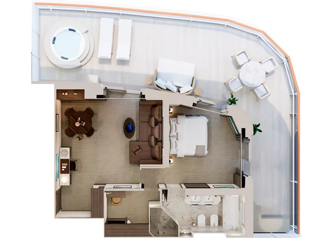 Ocean Residence - Cove Residence s vírivkou Suita + terasa s vírivkou a lehátkami 56 m². Spálňa s obývacou a jedálenskou časťou, šatník. Koktailová súprava, minibar, kávovar, vodná kanvica, ďalekohľad, sejf, kúpeľňa so sprchou. Závesy, svetlo, klimatizácia ovládané smart technológiou. Taška Technogym Case Kit. Fľaša šampanského na privítanie. Maximálna kapacita 3 osoby. 34 872 € 8 718 € za osobu