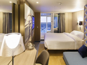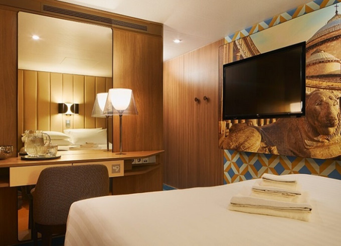 • Ubytovanie v kajute vybranej kategórie. Základné vybavenie: kúpeľňa s WC a sprchovacím kútom, 2 lôžka spojiteľné do manželskej postele, skrine, nočné stolíky, toaletný stolík a stolička, nastaviteľná klimatizácia, interaktívna satelitná TV s plochou obrazovkou, trezor, sušič na vlasy, uteráky a posteľné prádlo, Wi-Fi pripojenie (za poplatok), 24/7 kajutová služba (za poplatok).