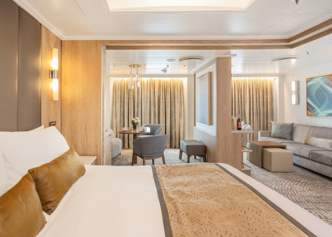 S2 - Signature Owner Suite 59 m² (vrátane balkonu). 10. paluba v strede, 16. paluba na korme. Max 4 osoby. Šatník, kúpeľňa s vaňou, oddelené WC, kávovar Nespresso. Výhody Signature Collection. | 11 736 € 5 868 € za osobu | ||