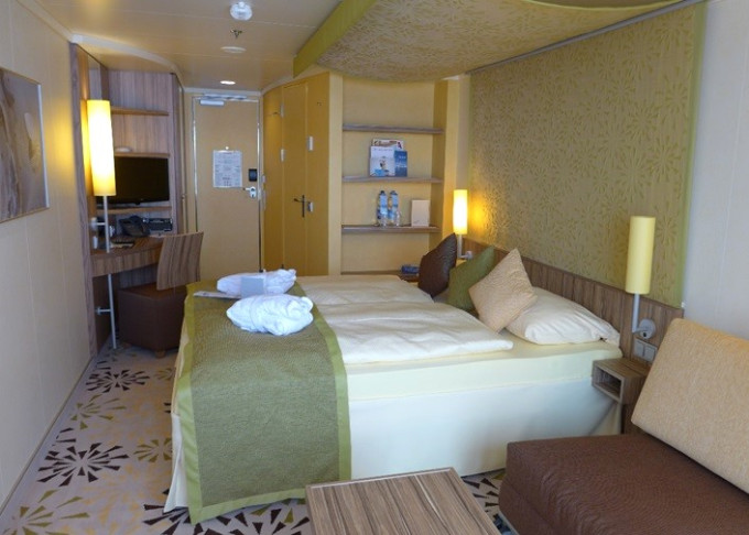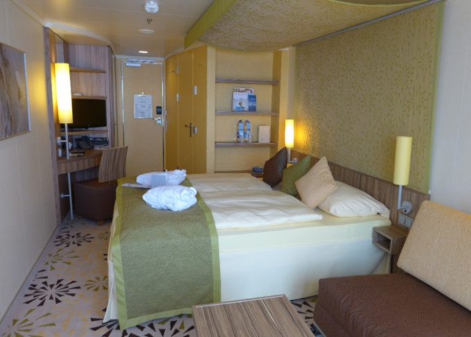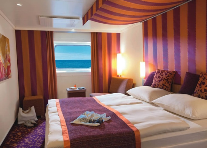 CA - Vonkajšia kajuta PREMIUM / obmedzený výhľad od 14 m². Neotvárateľné okno / obmedzený výhľad. 6. paluba. Max 4 osoby. Cenový model Premium. 1 750 € 875 € za osobu